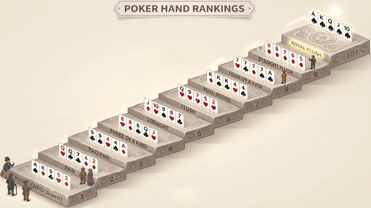 Picture it as a ladder. The higher up a hand sits, the stronger it is. You probably won’t make a Royal Flush or Straight Flush very often, but knowing exactly where every hand lands in the pecking order is what stops you from making costly mistakes at the table.